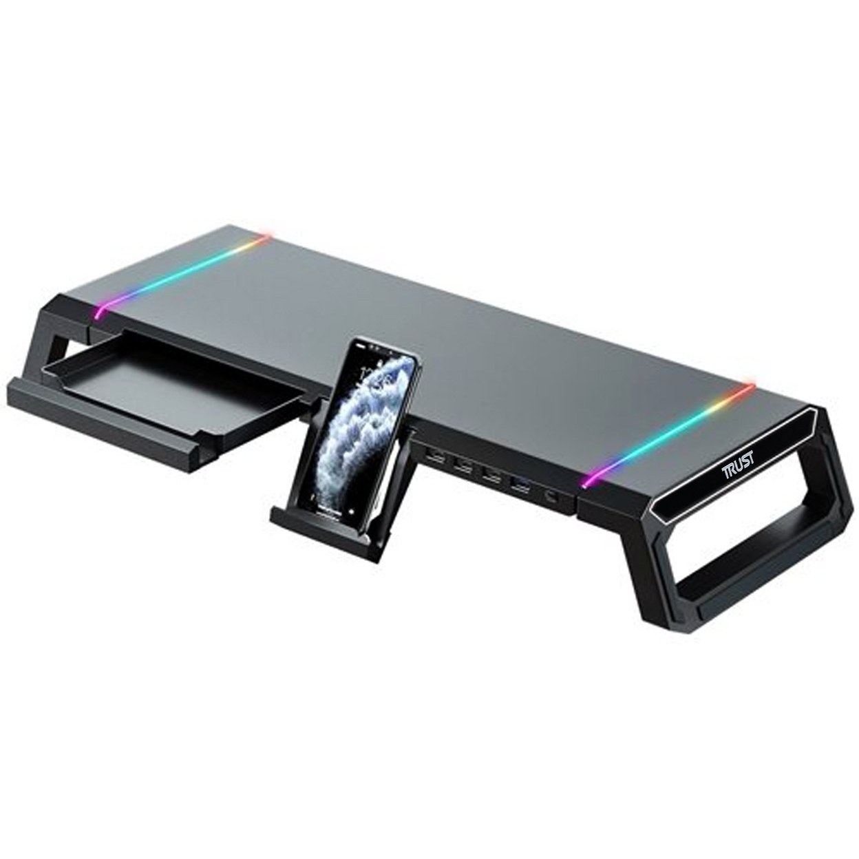 پایه نگهدارنده مانیتور تراست مدل TDESK در دو طرف این پایه، نوار های LED با قابلیت تنظیم نوع و حالت نور براساس سلیقه کاربر وجود دارد که این قابلیت به صورت RGB می باشد و در 10 مدل متفاوت میتوان نوع نوردهی را به صورت ثابت و متحرک تنظیم کرد.